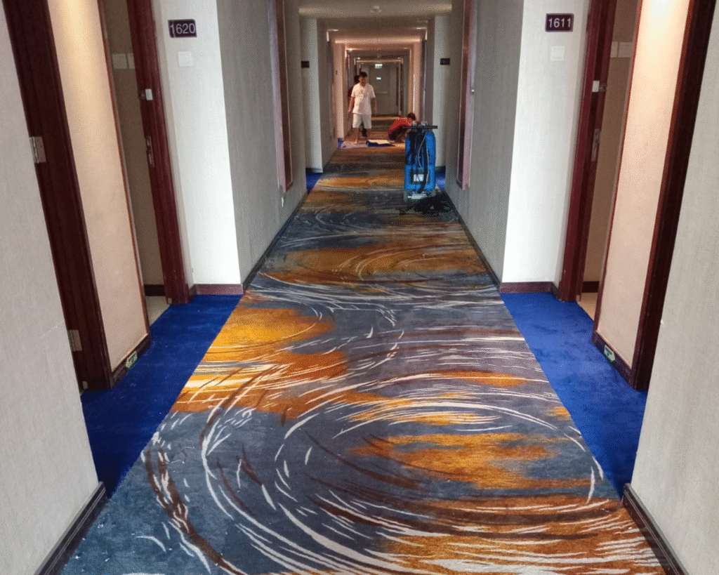 Karpet custom untuk lobby, ballroom, koridor, dan ruang meeting. Desain dibuat sesuai identitas brand hotel atau gedung agar tampil lebih elegan dan profesional.
